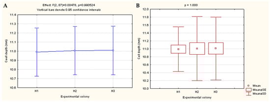 As presented in Figure 2, the results of the one-way ANOVA showed no statistically significant differences between the colonies with regard to the measured depth of the honeycomb cells (p = 0.990524).