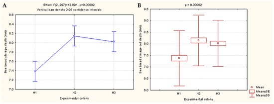 The results of the one-way ANOVA showed statistically significant differences between the colonies with regard to the bee bread storage depth (p = 0.00002) (Figure 3).