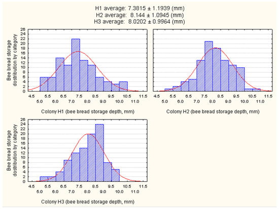 In order to estimate the depth of the bee bread storage in relation to the total depth of the honeycomb cells, the latter was also determined. As presented in Table 1, the average total depth of the honeycomb cells determined in experimental colony H1 was 10.99 mm, 11.01 mm in H2, and 11.01 mm colony H3, which reflects a great similarity of average values and confirms the well-known uniform architecture of honeycomb cells. The determined maximum values of the cell depth in the three experimental honey bee colonies also revealed high resemblance, at 12.05 mm, 11.98 mm. and 12.36 mm, respectively, while the most noticeable differences between the colonies (although not statistically significant, as noted below) were observed for the minimum cell depth values (9.71 mm determined in the H1 colony, 8.97 mm in the H2 colony, and 9.37 mm in H3 colony).