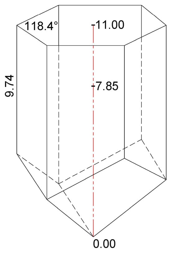 A three-dimensional view of the honeycomb cell representing the obtained results on the total cell depth (11.00 mm) and the depth of bee bread storage (7.85 mm) in A. m. carnica honeycomb, along with results on complementary measurements (average values of the smallest side length and the angle of the hexagonal cell).