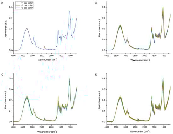 FTIR-ATR spectra of multifloral bee pollen (n = 1/colony) collected from experimental colonies H1, H2, and H3 (A); FTIR-ATR spectra of bee bread samples (n = 35/colony) collected from individual honeycomb cells of experimental colonies H1 (B), H2 (C), and H3 (D); different colors on (B–D) denote spectra of bee bread samples collected from individual honeycomb cells.