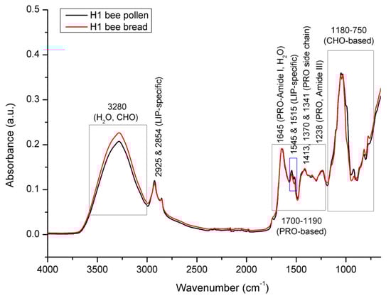 Average FTIR-ATR spectrum of bee pollen vs. bee bread from experimental colony H1, representing comparative spectral features with the assignation of major underlying molecular vibrations (whole spectral region from 4000 to 600 cm−1). CHO = carbohydrates; PRO = proteins; LIP = lipids.
