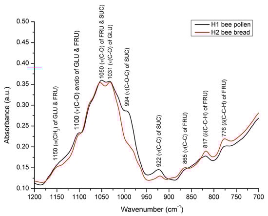 Furthermore, a comparative spectral analysis of BP vs. BB has revealed that considerable amounts of glucose are present in both BP and BB, but a slightly higher proportion was found in BP, which is reflected in the spectra of the analyzed samples. Namely, the absorption band at 922 cm−1, characteristic for C–C stretching vibrations of glucose, is more intense in the spectrum of bee pollen, while these differences are less pronounced at the position of the second band, characteristic for glucose, at 1031 cm−1. The aforementioned observations can also be associated with previously published data on the proportion of glucose, which in bee pollen averages at 12.4% [] and at 5.7% in bee bread [].