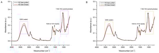 Average FTIR-ATR spectrum of bee pollen vs. bee bread from experimental colony H2 (A) and H3 (B), representing comparative spectral features with the assignation of major underlying molecular vibrations in the whole spectral region (4000–600 cm−1).