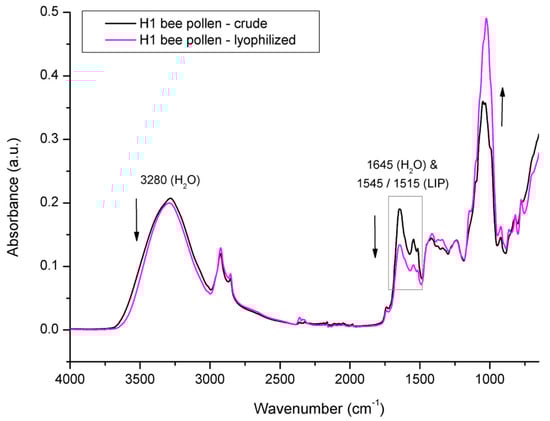 Average FTIR-ATR spectrum of crude bee pollen vs. lyophilized bee pollen from experimental colony H1, representing comparative spectral features.