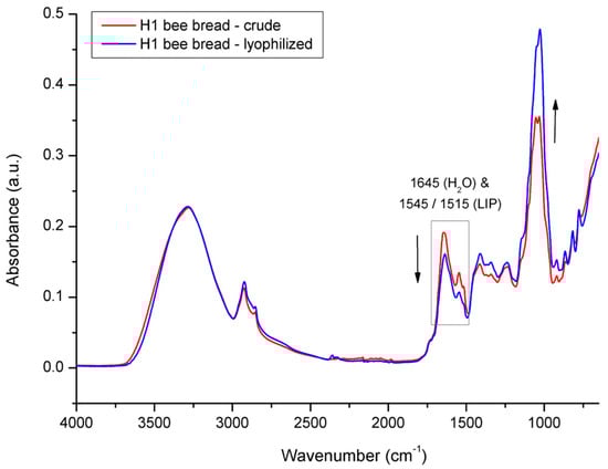 Average FTIR-ATR spectrum of crude bee bread vs. lyophilized bee bread from experimental colony H1, representing comparative spectral features.