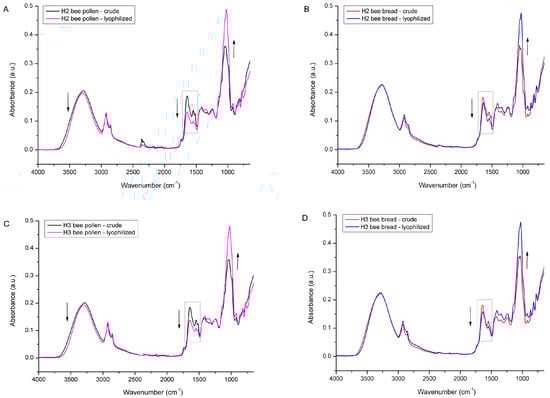 Average FTIR-ATR spectrum of crude bee pollen vs. lyophilized bee pollen (A) and crude bee bread vs. lyophilized bee bread (B) from experimental colony H2; crude bee pollen vs. lyophilized bee pollen (C) and crude bee bread vs. lyophilized bee bread (D) from experimental colony H3.