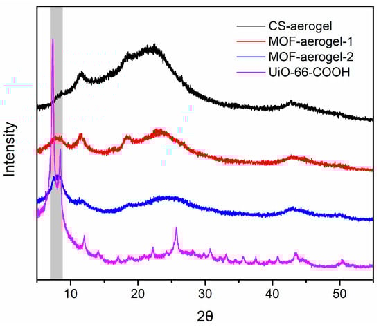 The crystalline structures of the synthesized UiO-66-COOH, CS-aerogel, MOF-aerogel-1, and MOF-aerogel-2 were characterized by XRD (Figure 1). For all aerogel networks, the characteristic peak at 11.59° was attributed to the presence of a hydrated chitosan crystalline skeleton [17,18]. All of the MOF-containing aerogels (MOF-aerogel-1 and MOF-aerogel-2) presented the specific diffraction patterns of the UiO-66 series MOFs in the range of 7.2~8.4° [19,20], in which the single broad peaks observed in the patterns of the two MOF-aerogels were attributed to the presence of the amorphous chitosan substrate. The broad MOF characteristic peaks also indicate the interaction of MOFs with amorphous chitosan chains. This diffraction pattern suggested that the MOF-aerogels sustained the intrinsic topological structures of both the chitosan aerogel and UiO-66-COOH; hence, this result indicated that the MOF was successfully anchored to the chitosan aerogel.