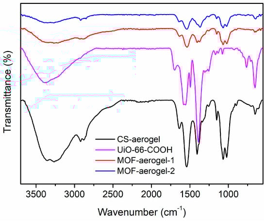 FTIR spectra of CS-aerogel, MOF-aerogel-1, MOF-aerogel-2, and UiO-66-COOH nanoparticles.