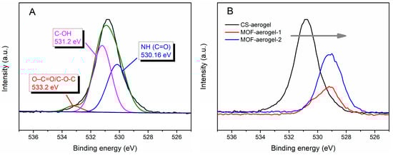 (A) High-resolution O1s XPS spectra of CS-aerogel. (B) The XPS spectra of O1s for CS-aerogel, MOF-aerogel-1, and MOF-aerogel-2.