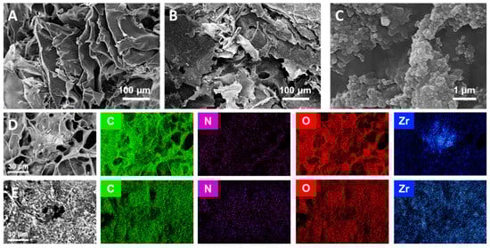 The surface morphological analysis of the CS-aerogel and MOF-aerogel-2 was conducted by SEM, and the images are displayed in Figure 4A–C. The resulting aerogels with or without MOF particles all showed multi-chamber-like lamellar structures with considerable wave-like chitosan flakes stacked into a layered conformation (Figure 4A,B). The two aerogels also exhibited porous structures with various pore sizes, which might be induced by the irregular growth of ice crystals during the freeze-thaw procedure and lyophilization [13]. The magnified view of the MOF-aerogel-2 in Figure 4C shows the presence of numerous polyhedral nanoparticles. After being covered by the carboxylic Zr-MOF nanocrystals, the external surface of the CS-aerogel became rougher, further illustrating that the MOF-aerogel composite was successfully obtained. Elemental distribution analysis of the MOF-aerogel composites conducted by energy dispersive spectroscopy elemental mapping showed that elements of carbon, nitrogen, oxygen, and zirconium were homogeneously distributed throughout the whole chitosan aerogel surface (Figure 4D,E) [28]. The observation of nitrogen and zirconium in the EDS map was due to the existence of chitosan and UiO-66-COOH, respectively. Figure 5 shows a scheme of multiscale structure in the ultra-light MOF-aerogel where the micron-sized carboxylic Zr-MOF were adhered to the surface of CS layers through electrostatic interaction. The interior surface of CS-aerogel tunnels contained a large amount of the glucosamine NH3+ group, which facilitated the interaction with carboxylic Zr-MOF under electrostatic absorptions. Consequently, the nanosized UiO-66-COOH particles adhered to the internal and external surfaces of the CS-aerogel skeleton.