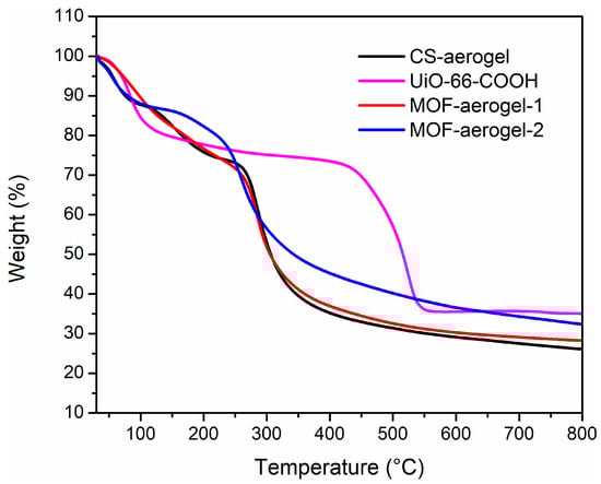 Thermal gravimetric analysis (TGA) was utilized to determine the thermal properties and stabilities of the UiO-66-COOH, CS-aerogel, MOF-aerogel-1, and MOF-aerogel-2 samples, and the results are shown in Figure 6. The CS-aerogel showed the lowest residue content of 26.4%. The residue contents of MOF-aerogel-1 and MOF-aerogel-2 significantly increased to 28.8% and 31.8%, respectively, indicating that the MOF-aerogels were more difficult to decompose than the CS-aerogel [17]. In addition, the residue content of the pristine MOF was 35.0%. The high residue contents of MOF-aerogels demonstrated that the CS-aerogel showed great potential in immobilizing MOF nanomaterials. In addition, the introduction of MOFs could potentially strengthen the thermal stability of the CS-aerogel.
