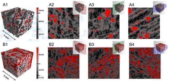 X-ray microtomography reconstructions of (A1) MOF-aerogel-1 and (B1) MOF-aerogel-2; two-dimensional side slice images in right, front, and transverse sections of (A2–A4) MOF-aerogel-1 and (B2–B4) MOF-aerogel-2.