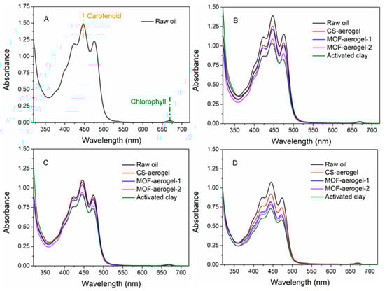 The majority of natural pigments in soybean oils are carotenoid and chlorophyll, and because the content of the latter was rather low, the adsorption capacity of carotenoid was utilized to evaluate the bleaching processes of soybean oil. Similar spectrophotometric methods were previously reported and performed to test the bleaching capacity of rapeseed oil [29], palm oil [2], and olive oil [31]. Intensities of the peaks of carotenoid at the position of 446 nm were ranked according to the following order: untreated raw oil > 50 °C-treated oil > 75 °C-treated oil > 100 °C-treated oil (Figure 8B–D). This result was due to the increase in temperature, which resulted in the partial degradation of the carotenoids [29]. Notably, thermal treatment at 100 °C showed a minor effect on the degradation of the carotenoids compared to the 75 °C treatment (Figure 8C,D). The adsorbents used for bleaching were ranked according to the carotenoid absorbances under gradient temperature as follows: CS-aerogel treated oil > MOF-aerogel-1 treated oil > MOF-aerogel-2 treated oil > activated clay treated oil. A lower carotenoid absorbance indicates a higher bleaching capacity. Furthermore, a small amount of chlorophyll was still present in the bleached soybean oil. In addition, with increasing temperatures, all bleaching agents showed a higher carotenoid removal ability. These results are also in accordance with the removal data, which are calculated and presented in Figure 9.