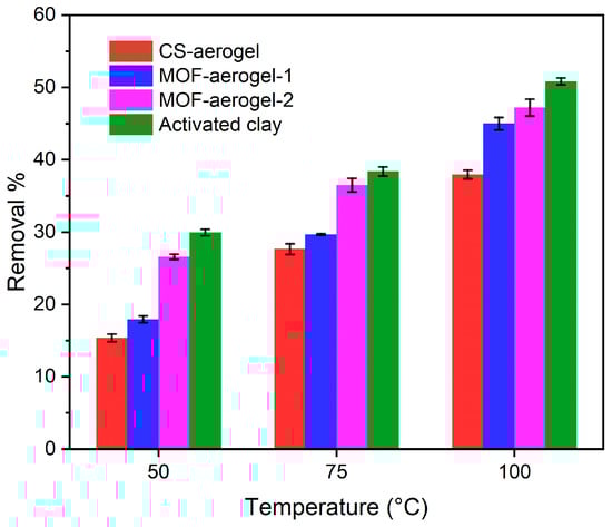 As shown in Figure 9, activated clay showed the best capacity for oil bleaching among all agents. The removal performances of this bleaching earth at 50 °C, 75 °C, and 100 °C were 29.9%, 38.4%, and 50.8%, respectively. Among the aerogels, all samples were capable of removing carotenoids. The MOF-aerogels performed better than the CS-aerogels. This result implied that UiO-66-COOH played a pivotal role in removing natural pigments from soybean oil. It has been widely reported that the bleaching power increases by introducing more surface area, porosity, reactive sites, and surface acidity of bleaching agents [32]. The oil bleaching process, which utilizes bleaching earth with high surface acidity, is generally considered a combination of catalytic and adsorptive reactions to remove natural pigments and undesirable components [33]. The introduction of UiO-66-COOH not only resulted in the introduction of carboxyl groups on the external surface of the chitosan substrate but also enhanced the porosity of the composite aerogel matrix. The removal performances of MOF-aerogel-1 under the 50 °C, 75 °C, and 100 °C treatments were 17.9%, 29.7%, and 45.0%, respectively. The higher MOF loading amount in MOF-aerogel-2 led to satisfying removal proportions of 26.6%, 36.5%, and 47.2% under different temperature gradients, and its performance was very similar to that of commercial activated clay and previously reported acid-activated bentonite [34]. In addition to the MOF content, the arrangement of particles also contributes to the adsorption. The 2D microtomographic images in Figure 7 showed that the MOF particles were distributed homogeneously on the surface of the chitosan lamellae of MOF-aerogel-2, while they aggregated densely within the MOF-aerogel-1 matrix. These different distribution patterns may lead to different macroscopic structural properties and bleaching capacities of the two MOF-aerogels.