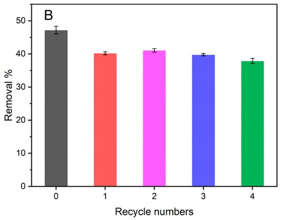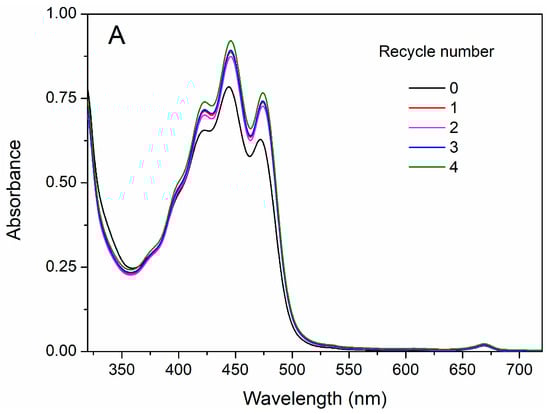 UV-vis spectra of bleached soybean oil (A) and carotenoid removal proportion (B) after multiple reuse cycles of MOF-aerogel.