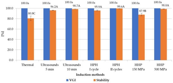 Effect of induction method on VGI and stability of inulin hydrogels (the average (n = 3) values marked with different letter symbols differ significantly (p < 0.05)).