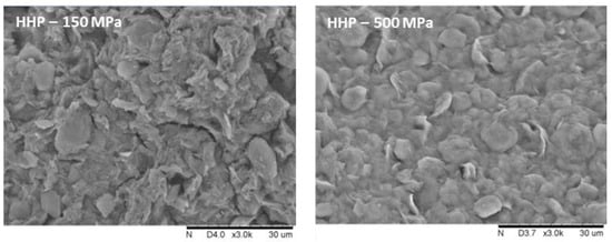 Based on the analysis of SEM microscopic images, it can be concluded that the gels obtained with non-thermal methods have a more flattened structure, and the visible particles are larger, but the structure is more compact (Figure 2). It was also noticed that the applied induction parameters for individual methods also had an impact on the structure of the hydrogels. First of all, it was observed that for a longer time of high-pressure treatment, two HPH cycles or higher HHP pressure, the samples had a more uniform and smoother structure, which is characterized also by lower porosity. These differences in the microstructure of inulin hydrogels induced with different methods were reflected in the measured texture parameters.