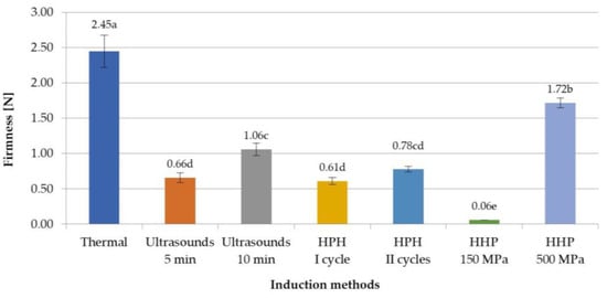 Effect of induction method on firmness of inulin hydrogels (the average values (n = 3) marked with different letter symbols differ significantly (p < 0.05)).