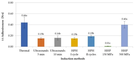 Effect of induction method on adhesiveness of inulin hydrogels (the average values (n = 3) marked with different letter symbols differ significantly (p < 0.05)).