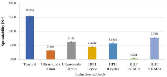 Effect of induction method on spreadability of inulin hydrogels (the average values (n = 3) marked with different letter symbols differ significantly (p < 0.05)).