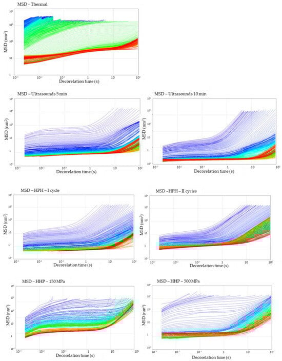 The microrheological properties of the hydrogel samples under static conditions were measured using Rheolaser. Based on the analysis of the average trajectory by numerous particles, the Mean Square Displacement (MSD) was investigated as a function of time (Figure 6). All tested samples were not a purely viscous product (Newtonian product), particles in the samples could not move freely, and MSD curves were not a linear function of decorrelation time. As a result of the interaction of particles with each other, polymeric structures were created, preventing the particles from moving, and these interactions gave the elasticity to the product. It was observed that the gel structure in samples obtained with methods other than thermal was already partially formed during the process. Meanwhile, the profiles of the MSD curves for the gel obtained with the thermal method indicate that with time, the movement of the particles was slowed down (observation based on the course of the curves—initial—blue and then green), and after time, their complete immobilization in the gel network (red MSD curves reached a plateau) was detected. The reason why the gelation point was visible for the thermal induction method is that the gel structure is formed during the chilling of the solutions, whereas in other induction methods, the structure begins to form while the samples are still under the induction conditions [38]. The non-thermal gel samples underwent changes in the direction of increasing the elasticity of the samples; however, the strong three-dimensional structure was also obtained. What is more, for the samples induced with HPH (I and II cycle) and HHP (150 MPa) in the last stage, it is also observed that the MSD curves became linear again with decorrelation time, which might be a result of the partial particle release from the gel network.