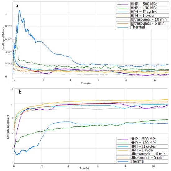 Solid–liquid balance (SLB) allows for determining when the solid phase begins to dominate in the solution and the solution begins to gel, forming a hydrogel structure (Figure 7a). When this parameter is below 0.5, the tested sample acquires the characteristics of a solid body, while in the range from 0.5 to 1, it behaves like a liquid. Thermally induced hydrogels at the beginning showed the properties of a liquid, the graph shows a clear peak, and a longer time was needed (about 2 h) for the solid phase to dominate in the structure, while induction with ultrasound and homogenization allowed for obtaining this parameter below 0.5 at the beginning of the analysis, which proves the dominance of the solid phase immediately after induction of gelation of inulin solutions. Gels induced by high hydrostatic pressures, similarly to thermal gels, at the beginning of the analysis showed the properties of a liquid, but quite quickly (after about 20 min), the SLB value began to decrease, and no clear peak was noted for 500 MPa, which proves a shorter gel time compared to thermally induced gels.