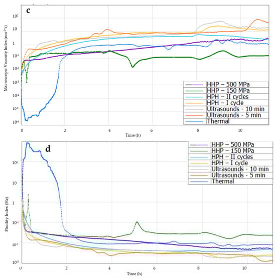 The Macroscopic Viscosity Index (MVI) allows for obtaining macroscopic viscosity curves (Figure 7c). It was found that up to the second hour after induction, the MVI of gels induced with non-thermal methods was higher than with the thermal method, which resulted from the subsequent formation of the gel structure. Analyzing the MVI curves 12 h after induction, it was found that the use of the ultrasonic method and HPH (first cycle) allowed for obtaining gels with a slightly higher MVI than in the case of traditional thermal induction. The lowest MVI was obtained for gels induced using HHP induction at 150 MPa. It was also found that increasing the pressure during HHP induction to 500 MPa resulted in obtaining inulin gels with higher viscosity, similar to thermally induced gels.