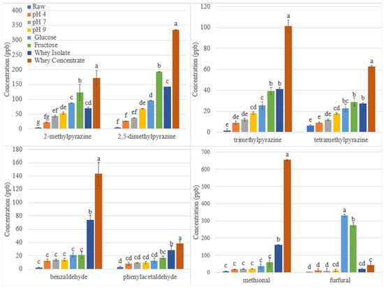 Whey protein isolate and concentrate increased the pyrazines and Strecker aldehydes more than the reducing sugar and pH, thus increasing the desirable aromas. Furfural increased significantly only for the reducing sugar treatment.