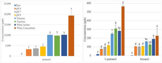 While there was no effect of pH, adding the reducing sugars glucose and fructose significantly increased the concentrations of pentanal, pentan-1-ol, and hexanal (Figure 2). In previous studies, fructose and glucose had contradictory effects on the formation of these volatiles. Fructose and glucose were found to accelerate the autoxidation of linoleic acid [] but also to decrease hexanal formation in crackers [] and serve as antioxidants in minced fish []. The type of reducing sugar (fructose versus glucose) did not affect lipid oxidation volatile formation.