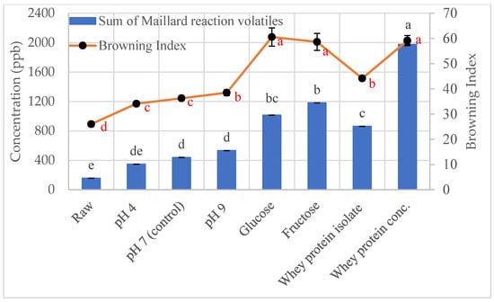 The conditions that increased the total concentration of Maillard volatiles also increased the Browning index values (Figure 3). The chroma (Figure A1) and ∆E (Figure A2) values exhibited the same trend as the Browning index. In increasing order of total Maillard volatile concentration and brownness, the samples were raw, pH 4, pH 7, pH 9, whey protein isolate, glucose, fructose, and whey protein concentrate.