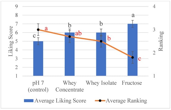 Average liking score (bars) and average ranking (points) of the aroma of roasted sunflower seeds treatments: pH 7, whey protein concentrate, whey protein isolate, and fructose. Different letters in black indicate significant difference (p < 0.05) in the liking score and different letters in red indicate significant difference (p < 0.05) for the ranking.