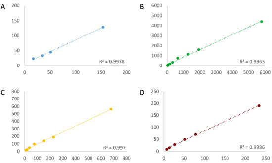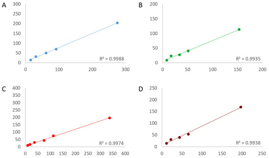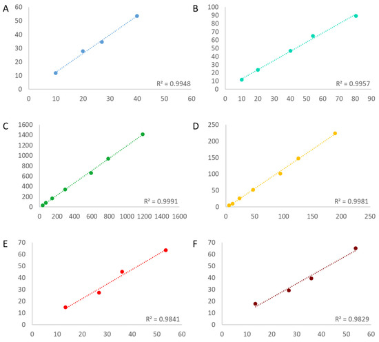 In order to determine the linearity of the assays, first, the copy number of the targets needed to be estimated. The estimation was conducted by a simplex assay on the QX100 platform (BioRad), and the bias to the assigned value was calculated (Supplementary Tables S14 and S15). With R2 above 0.98 for all targets in all three assays, the linearity was acceptable even at a very low copy number concentration (Figure 1, Figure 2 and Figure 3). The bias between the estimated and the measured value was consistently greater for all targets in both 4-plex assays compared to the 6-plex assay.