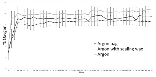 Storage atmospheres (argon) trend during the entire observation period in the three types of packages used (naked bottle, bottle with wax, and bag). Data are reported as the mean of the values with n = 10.