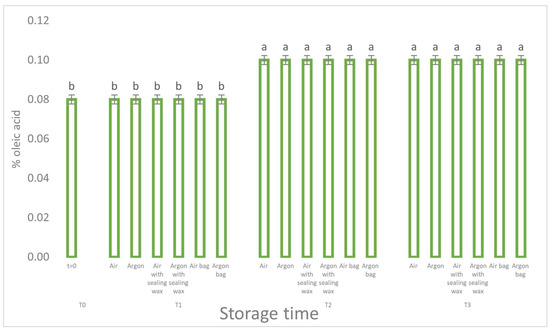 Free acidity trend as a function of storage time (t = 0, t = 1, t = 2, t = 3) for the 6 samples considered. Letters (a, b) indicate significant differences (p < 5%) over time after ANOVA (analysis of variance).