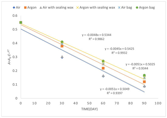 Furthermore, the addition of a sealing wax cover on the cap (Air with sealing wax and Argon with sealing wax) seems to provide an additional benefit in oil preservation compared to conditions without sealing wax. The kinetic rate constants for oil with sealing wax are lower than those without sealing wax, indicating greater stability of the oil over time.