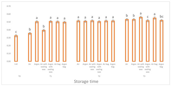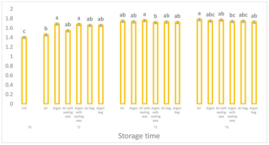 Analyzing the results, we can see how the free acidity values (Figure 2), an indicative parameter of the hydrolytic process for the different packaging methods, did not report any statistically significant differences. The increase in free acidity is, in fact, the same for all the theses considered.