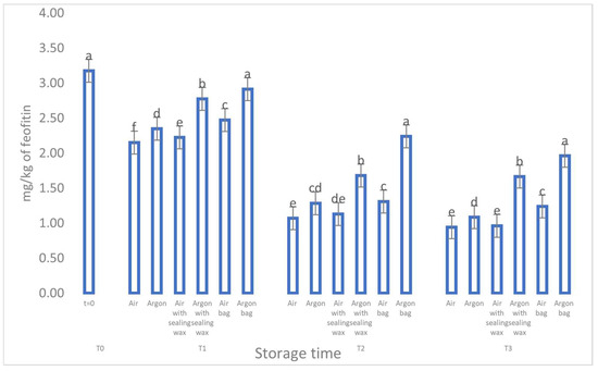 The data concerning the chlorophyll and carotenoid content (as shown in Figure 7 and Figure 8) and their correlation to the presence of pheophytin and lutein, respectively [23], reaffirm the pattern observed for the phenolic compounds. During storage, all analyzed samples exhibited a consistent and significant reduction in these compounds, particularly the samples stored in air. However, oils stored in argon with the additional sealing wax and an external bag better preserved these compounds and maintained higher values throughout the entire preservation period.