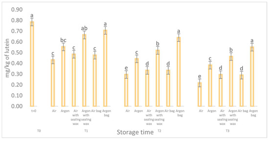 Trend of the carotenoids of the samples as a function of the storage time (t = 0, t = 1, t = 2, t = 3) for the 6 samples considered. Letters (a, b, etc.) indicate significant differences (p < 5%) over time after ANOVA (analysis of variance).