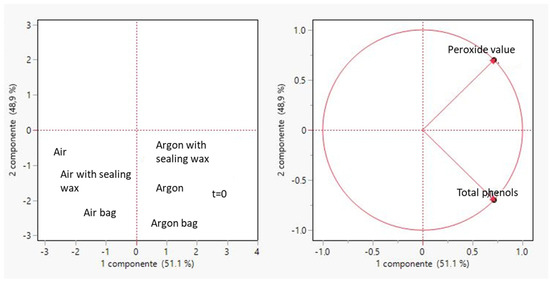 The principal component analysis was performed in order to correlate the course of the degradation processes with the decrease of phenolic compounds. From Figure 9, it can be seen that the three types of packaging used are arranged in the same quadrant, highlighting a similar trend in the degradative processes, which lead to an inevitable degradation of the phenolic compounds as previously described [25]. Specifically, the presence of argon sealed within the bottle enables the product to resist oxidation for an extended period. At the initial moment (time zero), the oil occupies the same category as the three oils packaged in the three different types of containers; however, this is achieved by incorporating argon into the packaging process.