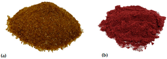 A mixture of the blackberry juice and lentil protein isolate with no further ingredients was prepared and processed into juice encapsulates via freeze-drying. The general appearances of the LPI and EBJ are shown in Figure 1, and the physicochemical properties of these samples are presented in Table 1.
