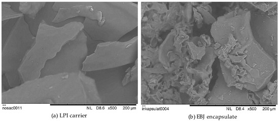 The morphologies of the carrier (LPI) and encapsulate (EBJ) are shown in Figure 2. The carrier was similar to broken glass and had a square–rectangular structure with smooth, straight edges (Figure 2a). The reason for this structure may be in the obtaining procedure, namely in the low temperature and the lack of forces that alter the surface topology during the evaporation process [24,48]. Figure 2b shows the structure of the freeze-dried encapsulate in which the base is the described carrier with particles different in diameter, irregular shapes, pores, and wrinkles. According to Fernandes et al. [49], this structure originates from encapsulated phytochemicals and indicates the encapsulating agent’s suitability.