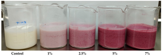 The appearances of the kefirs after fortification with EBJ at concentration levels of 1, 2.5, 5, and 7.5% (w/w) are shown in Figure 3. With the increasing encapsulate concentrations, the produced color became more intense. The introduced encapsulate was not dispersed homogeneously within the product; the appearance of stains or pigmented grains can be observed. Because the solubility of EBJ is low (29.30%, Table 1), this appearance of the kefir samples was expected.