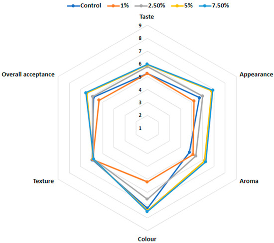 The sensory evaluation showed that different percentages of EBJ strongly modified the sensory attributes of the kefir (Figure 4). The panelists demonstrated a clear preference for the kefir fortified with EBJ at greater concentrations. The most preferred samples by the panelists were the kefir containing 7.5% EBJ (6.50 overall acceptability score) GAP, followed by the kefir containing 5% EBJ (6.42 overall acceptability score). The least preferred concentration among all the kefirs was 1% (5.34 score for overall acceptability). A similar trend was reported by Šeregelj et al. [65] when evaluating the sensory acceptance of yogurt fortified with red pepper waste encapsulate. In addition, similar results of acceptance were reported by Rubio et al. [66] for colored yogurts using colorants extracted from grape pomace and jabuticaba by-products and encapsulated via spray-drying using brewer’s spent yeast as the carrier. In the study by Domingos Pinto et al. [67], the panelists showed good acceptance for all the tested attributes of yogurt colored with anthocyanin-rich pigment prepared from jabuticaba skin. The authors noted that natural pigments have the potential to be a substitute synthetic color additive to produce mixed-berry yogurts.
