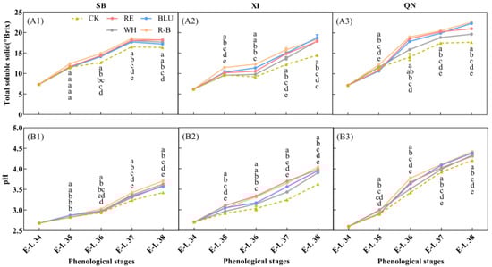 Total soluble solid (A1–A3) and pH (B1–B3) in grapes of different treatments across 5 phenological stages. CK: no light treatment; RE: red light treatment; BLU: blue light treatment; WH: white light treatment; R-B: red and blue light treatment (1:1). The error bars show the standard deviation of the mean (n = 3). Different letters indicate significant differences among treatments by one-way ANOVA (p < 0.05).