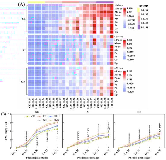 (A) Heat map of the content of individual anthocyanins in grapes from different treatments at five phenological stages. The data were Z-score normalised using Origin software 2021. Different cell colours in the heatmap represent a high concentration (red) or a low concentration (blue). Abbreviations: CK, no light treatment; RE, red light treatment; BLU, blue light treatment; WH, white light treatment; R-B, red and blue light treatment (1:1); Dp, delphinidin-3-O-glucoside; Cy, cyanidin-3-O-glucoside; Pt, petunidin-3-O-glucoside; Pn, peonidin-3-O-glucoside; Mv, malvidin-3-O-glucoside; Pn-ac, peonidin-3-O-(6-O-acetyl)-glucoside; Mv-ac, malvidin-3-O-(6-O-acetyl)-glucoside; t-Pn-co, trans-peonidin-3-O-(6-O-p-coumaryl)-glucoside; t-Mv-co, trans-malvidin-3-O-(6-O-p-coumaryl)-glucoside. (B) Total anthocyanin content of grapes from different treatments across 5 phenological stages. Each anthocyanin concentration was calculated on the basis of dry weight of the grape skin. Error bars are the standard deviation of the mean (n = 3). Different letters indicate significant differences among treatments using Duncan’s test (p < 0.05). Abbreviations: TAC, total anthocyanin content; DW, skin dry weight.