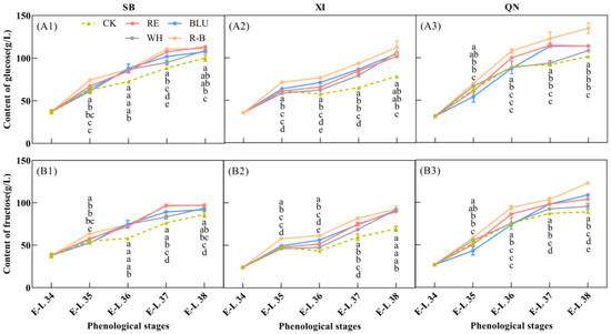 Glucose (A1–A3) and fructose (B1–B3) content of grapes from different treatments at 5 phenological stages. Each hexose content was calculated on the basis of fresh tissues of the whole berries. Error bars are the standard deviation of the mean (n = 3). Different letters indicate significant differences among treatments using Duncan’s test (p < 0.05). Abbreviations: CK, no light treatment; RE, red light treatment; BLU, blue light treatment; WH, white light treatment; R-B, red and blue light treatment (1:1).