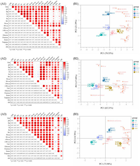 (A1–A3) Correlation analysis of 18 quality indicators in SB, XI, and QN. The legend on the right represents the correlation between indicators from low (deep red) to high (deep blue), and the numbers in the bottom left of the heatmap represent the percentage of correlation coefficients. Abbreviations: CK, no light treatment; RE, red light treatment; BLU, blue light treatment; WH, white light treatment; R-B, red and blue light treatment (1:1). (B1–B3) Loading values of the grape quality indicators in the two PCs and the distribution of different treatments in SB, XI and QN.