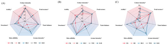 (A–C) Radar plots of sensory assessment of different treatments at harvest for SB, XI, and QN. * denotes statistical significance among treatments using one-way ANOVA (p < 0.05). Abbreviations: CK, no light treatment; RE, red light treatment; BLU, blue light treatment; WH, white light treatment; R-B, red and blue light treatment (1:1).