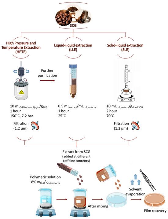 Particularly, 512, 676, and 840 µg caffeine/g PLA of the HPTE extracts and 512, 676, 840, 1167, and 1494 µg caffeine/g PLA of the LLE extracts were tested. The extracts and polymer solution (Figure 1) were mixed for 6 h, then sonicated in an ultrasonic bath (700 W, 1 min) to remove the air bubbles. Finally, 5 mL of the product was poured on 9-cm diameter glass Petri plates. The chloroform removal was performed under the hood until complete evaporation before peeling the films from the mold.